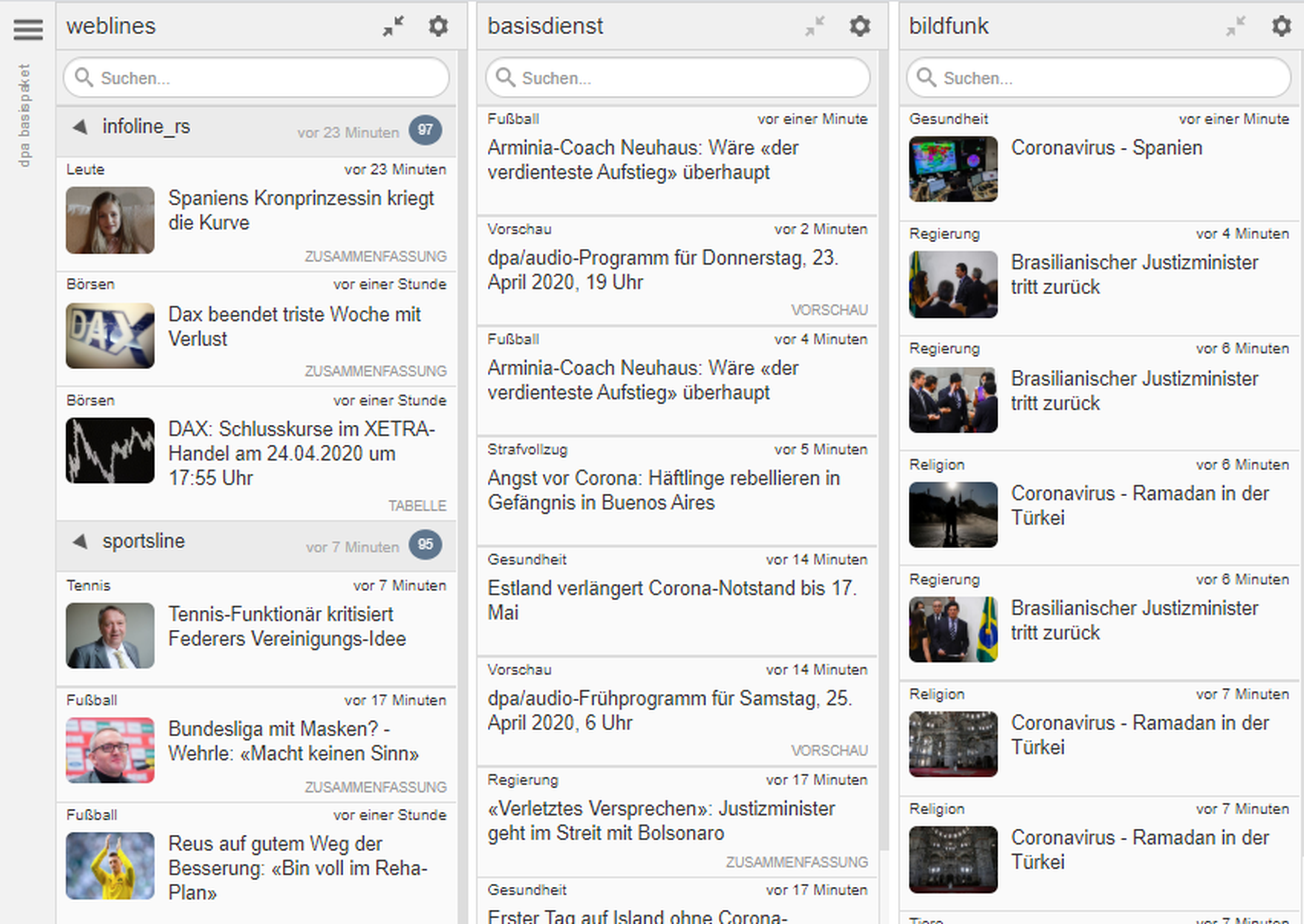 Das übergreifende Agentureingangssystem für CvDs und Redakteure: In klassischer Spaltenoptik lassen sich alle Inhalte der dpa und anderer Nachrichtenagenturen mitlesen, filtern und kuratieren. Layout und Funktionalität ist für die ganztägige Nutzung optimiert.